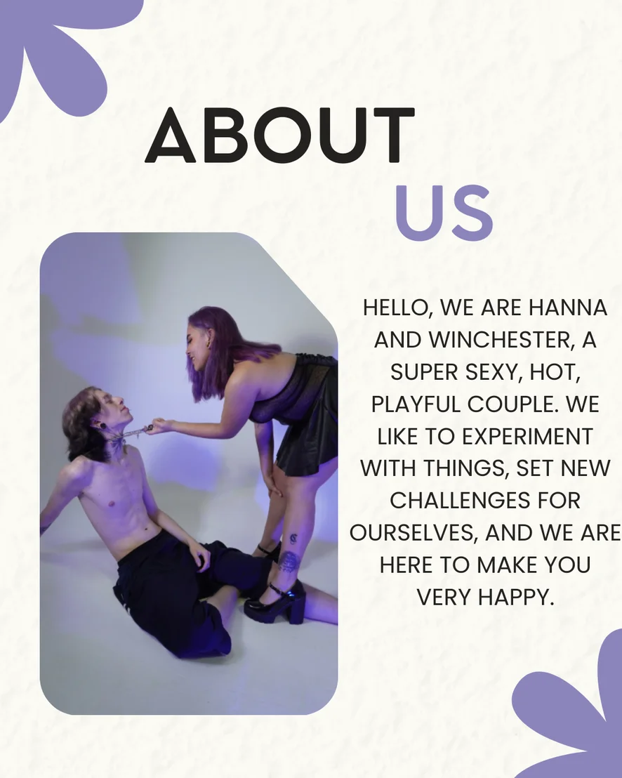 HELLO, WE ARE HANNA AND WINCHESTER, A SUPER SEXY, HOT, PLAYFUL COUPLE. WE LIKE TO EXPERIMENT WITH THINGS, SET NEW CHALLENGES FOR OURSELVES, AND WE ARE HERE TO MAKE YOU VERY HAPPY 💜